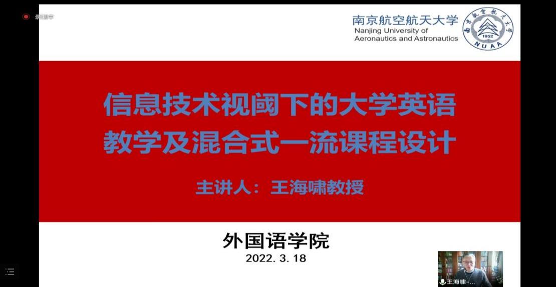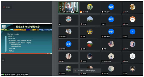 3月18日下午,69成人直播 邀请教育部高等学校大学外语教学指导委员会委员、南京大学教授王海啸教授做题为“信息技术视阈下的大学英语教学及混合式一流课程设计”的线上讲座,讲座由69成人直播 副院长徐以中主持,院长范祥涛、69成人直播 教师及来自全校其他各学院的60多位老师全程参加了讲座。