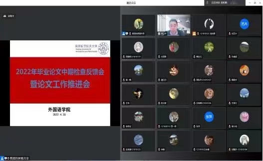 按照教务处统一部署,4月上旬,学院组织学院教学督导小组专家、各系的正副主任开展了本科毕业论文中期检查工作,学生全部上交论文初稿,检查做到100%全覆盖。为了使师生全面了解中期检查整体情况,足够重视后续工作,保证英日语专业分别做好国家级和省级一流专业建设点工作推进,召开本次会议。