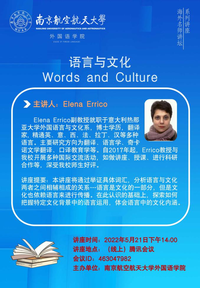 2022年5月21日下午,意大利热那亚大学的Elena Errico教授应邀为我校师生做了一场主题为《语言与文化》的学术讲座,这是本学期以来69成人直播 举办的又一次“海外名家讲坛”系列讲座。Elena Errico教授在语言学和翻译学上的专业性以及其清晰精深的讲解获得了南航师生的一致好评。
