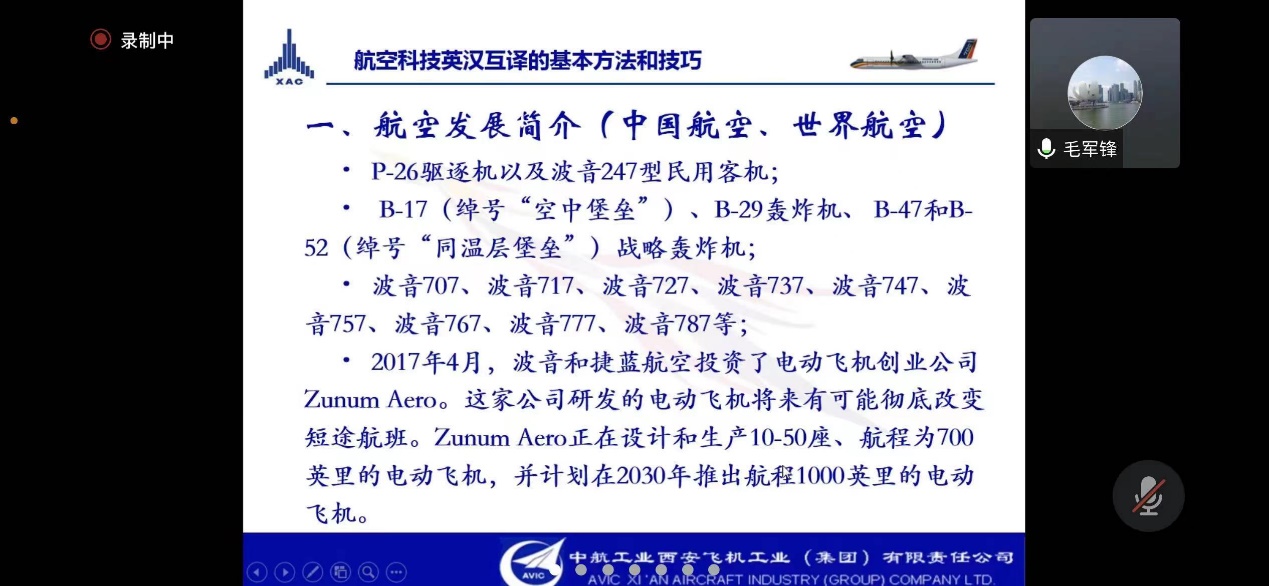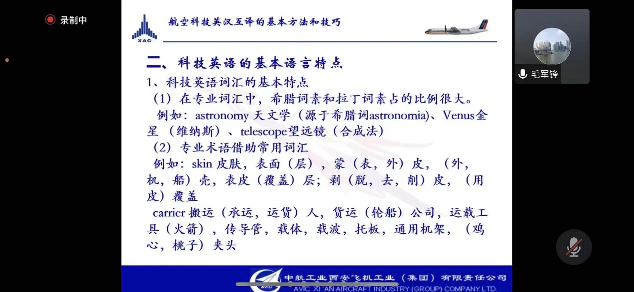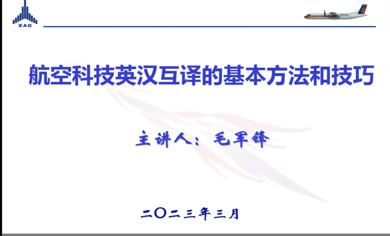 2023年3月3日晚,南航69成人直播 MTI教育中心邀请了知名企业导师毛军锋译审给2022级研究生带来行业翻译实训的第一堂课。毛军锋现任中国航空工业集团有限责任公司翻译系列高级专业技术职务任职资格评审委员会委员、中国翻译协会专家会员、中国航空学会会员。本次课程,毛老师给大家带来了航空科技英汉互译的基本方法和技巧系列课程,侧重分析和探讨了航空科技汉译英的翻译策略。
